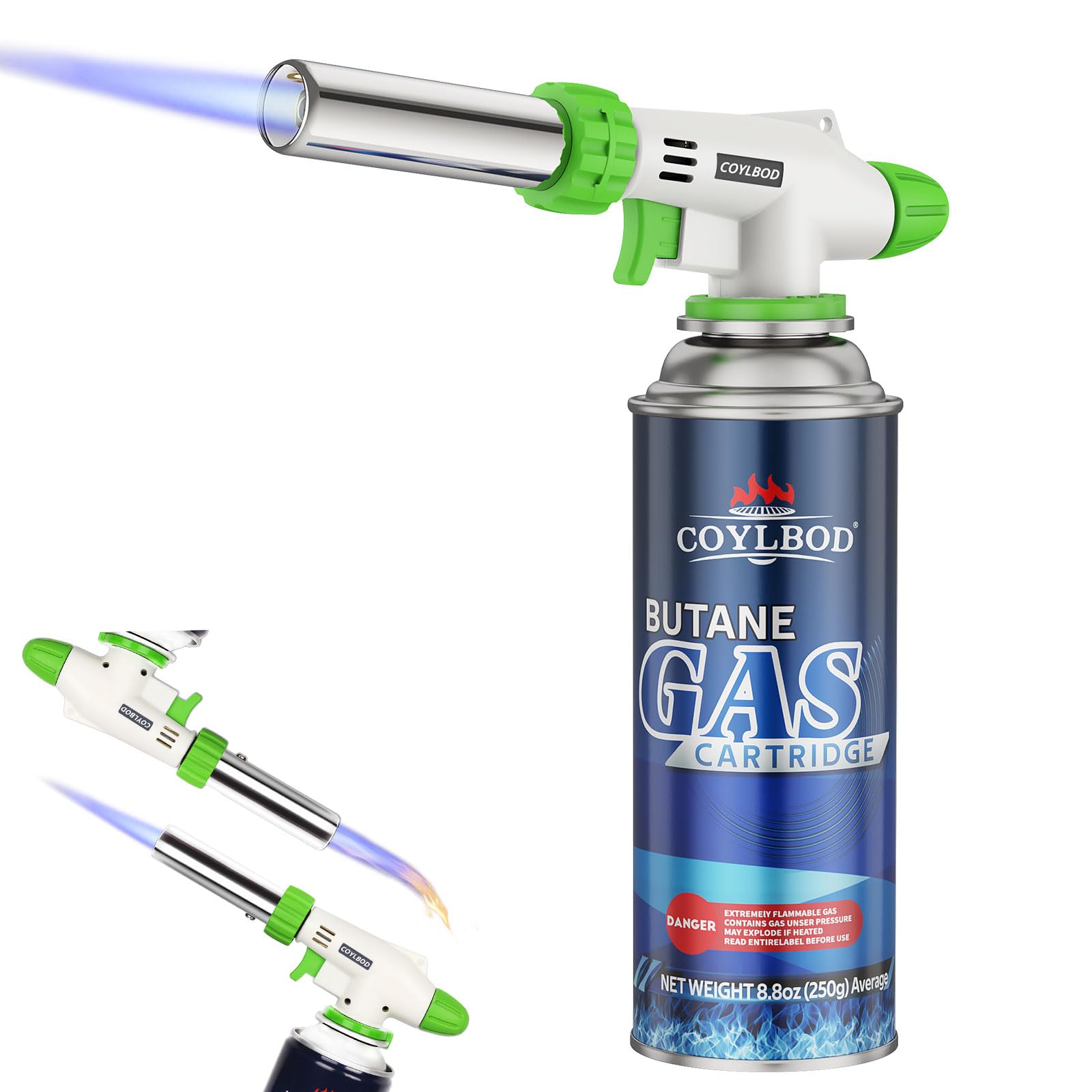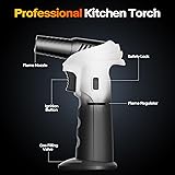 Rotatable Torch Head Design: CoYlBod is committed to provide simple and convenient products to our customers. For this food torch, you can rotate the gun head 90° to complete various gourmet and DIY. Don’t worry about gravity affecting the size of the flame. Professional Grade: Perfect for a professional chef or avid home bakers, our culinary torch provides unmatched flame consistency and reliability. Piezo ignitors provide instant ignition at temperatures up to 1300 °C/2372 °F for fast heat-ups that save you valuable time. WARNING: To avoid too much internal pressure, cooking torches Should NOT Be Overfilled. Multi-purpose Soldering Torch: The handheld blow torch is suitable for different applications including gourmet cooking, arts and crafts projects, jewelry making, and small welding applications. It is a portable mini torch that you can take for many outdoor activities like camping and BBQ. Adjustable Flame & Continuously Flame Mode: Light up with Piezo Ignition Technology, simply press the ignition button and then push safety lock down at the same time, the flame keeps burning with no need to keep pressing the button. Adjusting the fuel flow valve left or right makes it easy to precisely control the flame size to achieve a beautiful, caramelized crust on your creme brulee or other culinary creations. Refillable and Safe to Operate: Refill the creme brulee torch with any brand of butane. Please note that butane gas is not included. Simply slide the security lock to open, light up with Piezo Ignition Technology. This well - designed security lock ensures safe storage and transportation, preventing accidental ignition. Important Note: In order to comply with USPS safety regulations, the refillable torch lighter will not be filled with butane when it shipped.