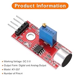 - What is this? Ultrasonic module, This high-sensitivity microphone sensor module is suitable for voice recognition systems and can capture and transmit sound signals. It can be used for voice-controlled switch applications such as voice-controlled lights and voice-controlled electronic devices. In addition, in environmental monitoring, it can be used to detect noise levels or sound frequencies. What will I get? The Microphone Sound Sensor, we provide here, is in size of: Working Voltage: DC 5 V Output Form: Digital and Analog Output Model: KY-037 Number of Pins:4 In the package of: 4 x Voice Sound Detection Sensor Are there any advantages of the product? High sensitivity: The sound sensor module has high sensitivity and can accurately capture sound signals in the environment. Easy interface: Simple connection to various microcontrollers or electronic devices for easy integration and use. Stability: Provides stable performance and reliable sound detection function. How to use it? 1. Connect the sound detection sensor to your microcontroller correctly, confirming the connections are correct, including the power and signal pins. 2. Provide the appropriate voltage to power the sensor. 3. Write the code suitable for sound detection. 4. Test and calibrate the accuracy. What should I notice? Please select the specific microphone voice sound sensor model according to your needs