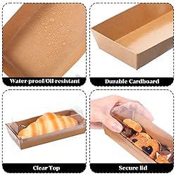 - Telooco 50 Pack Large charcuterie boxes with Clear LidsOur Telooco charcuterie board with lid is designed to provide a sturdy and reliable solution for your food packaging needs. Made from high-quality cardboard and food-grade PET plastic, these charcuterie boxes ensure your food stays fresh and intact during transport.Specifications:Material: Cardboard, PET plasticColor: BrownSize: 17.2x7x5.8cm (6.8x2.7x2.3 inches)Opening Size: 18.7x8.6cm (7.4x3.4 inches)Package Includes: 50pcs large disposable charcuterie boxesNote:Please do not put the boxes directly into the oven or microwave to heat. The clear lids are made of PET plastic and cannot withstand high temperatures.