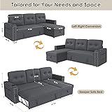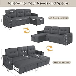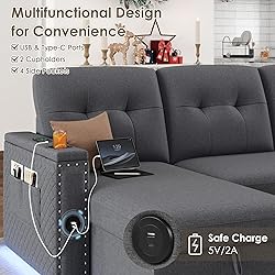 ONE-STEP CONVERSION INTO A SLEEPER BED: With its pull-out strap and smooth wheels, the L shaped couch can easily transform into a sleeper sofa, crafted with a sturdy steel frame and solid wood slats, ensuring durability and a squeak-free sleeping experience. This pull out couch is perfect for accommodating overnight guests or enjoying a cozy movie night with your family ( 1.Weight Capacity: 1100lbs; 2.Inner Size of Sofa Bed: 75" x 50" ) COUCH WITH SMART LED LIGHT: Our couch features smart LED strips under the armrest, controlled via an app and remote. With over 16 million colors, 20+ light effects, and various modes, you can effortlessly set the perfect ambiance for any occasion—from soothing movie nights to vibrant parties, and you can synchronize the lights with your music to enhance your entertainment experiences. The integrated LED lights also act as a gentle nightlight when you pull out the sofa bed for a sleep, enhancing your sleeping atmosphere AMPLE STORAGE SPACE: The spacious storage compartment beneath the chaise lounge allows you to easily store blankets, pillows, and more, keeping your living room organized and tidy. The integrated storage armrest and side pocket add practicality, offering convenient spots for magazines, remotes, and electronic devices, ensuring everything you need is within reach. This maximized storage design is a smart addition to any modern home CHARGING STATION & CUP HOLDERS: With convenient USB and Type-C ports on both armrests, you can effortlessly charge your devices while binge-watching your favorite series. The built-in cup holders ensure you can enjoy your favorite beverages without worrying about spills, elevating your home entertainment experience and making leisure time more enjoyable than ever CONVERTIBLE, COMFORTABLE, STYLISH: The reversible chaise lounge can be flexibly placed on either the left or right side of the sofa, adapting to any room's style and layout—such as living room, office, small apartments, dorm, studio, home theater room. Its deep seat, filled with high-elasticity foam, and the fluffy backrest are thoughtfully crafted with ergonomic principles in mind, providing exceptional support and eliminating fatigue. The elegant nailhead trim and sleek silhouette blend retro chic with modern luxury, making this 3-seat sofa a perfect living room furniture piece for any home MODERN FABRIC -LINEN CLOTH: The high-quality linen fabric covers the entire surface of the sectional couch. It is breathable, skin-friendly, and resistant to wear and wrinkles, adding a touch of timeless chic. Regular vacuuming can help remove dust and debris, while For stains, it's advisable to address them quickly with a mild soap and water solution; for stubborn stains, clean with a professional sofa cleaner TWO PACKAGE & EASY ASSEMBLY: The L shaped sectional sofa with a pull out bed is shipped in two packages, which include all components and tools, along with clear instructions for easy installation. No extra tools are needed, and setup can be completed in just 20 minutes with two adults