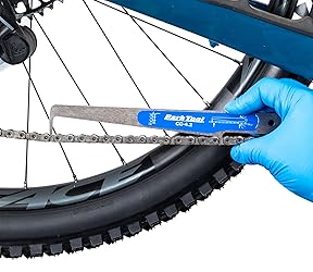 - A worn bicycle chain causes poor shifting performance and and actually wear out drivetrain components, causing more expensive problems. The Park Tool CC-4.2 Chain Checker is a drop-in style gauge that measures bicycle chain wear. The laser cut CC-4.2 accurately measures a long section of chain and strategically comes in contact with the chain in three places, quickly and easily taking the guesswork out of determining when chain replacement is necessary. The tool works on any 5 to 13-speed derailleur chain (including SRAM AXS and Shimano XTR 12-speed chains) and is designed to accurately indicate when a chain reaches 0.5%, 0.75% and 1.0% wear, the points at which most chain manufacturers suggest replacement. The CC-4.2 provides measurements at the two most common wear intervals recommended for chain replacement on multi-speed bicycles: <0.5% Wear - acceptable on all derailleur and single-speed drivetrains. ≥0.5% Wear - 11-to-12-speed chains should be replaced at or before this measurement ≥0.75% Wear - 5-to-10-speed chains should be replaced at or before this measurement ≥1.0% Wear - chains on single-speed and two-sprocket systems should be replaced at or before this measurement