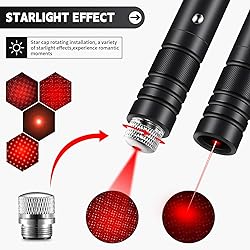 【Precision Focus】Our laser pointer has high power, and rotating the silver star cap can obtain multiple light patterns. Removing the star cap can obtain focused laser, making the visible distance even farther. 【USB Charging】Simply unscrew the bottom cap and connect it to any standard USB port to charge. Whether you use a computer, laptop, phone charger, or power bank, the laser pointer pen can be easily charged. 【Widely Used】Our red laser pointer, with high power, is suitable for various purposes such as demonstrations, astronomy, hiking, hunting, and camping. 【Material】Made of high-quality aluminum alloy, frosted shell, comfortable to the touch, sturdy and durable. The carefully designed bracelet makes it easy to grip and carry. 【Safety Precautions】Do not shine the laser pointer directly into human or animal eyes.