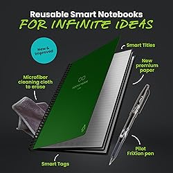 New and Improved Core: Features premium reusable paper, with improved pen to paper feel, spiral binding and sleekly re-designed, scratch-resistant cover. College-ruled sheets now include Smart Titles and Smart Tags to name and organize files efficiently. App-Enabled for Digital Organization: Scan and upload your written work directly to cloud platforms like Google Drive, Dropbox, OneNote, etc. and access your notes from anywhere. Use Smart Titles and Smart Tags to name and organize files efficiently. Write, Digitize, Erase, and Re-Write: Write notes with the included Pilot Frixion Pen, digitize effortlessly using the Rocketbook app, store in your preferred cloud service. When done, simply wipe the pages clean with a damp cloth and start fresh. Portable and Versatile Sizes: Available in two sizes—Letter (8.5 x 11 inches) and Executive (6 x 8.8 inches)—the Rocketbook Core is compact enough to fit into backpacks, purses, or briefcases. This notebook offers portability and versatility. Eco-Friendly Reusability: Designed with sustainability in mind, Rocketbook notebooks help reduce paper waste with a reusable alternative. Enjoy a paper-like notebook that can be used repeatedly, allowing you to save work and erase everything else.