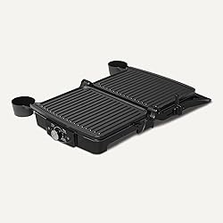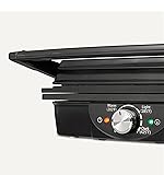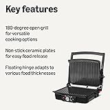 TEMPERATURE CONTROL: Adjustable temperature control (203-425°F) with indicator lights allows precise heat settings for various foods from sandwiches to grilled meats NON-STICK SURFACE: BPA-free ceramic coating plates offer effortless food release and easy cleaning VERSATILE DESIGN: Use as contact grill and panini press for sandwiches and meats with floating hinge to adjust for thickness, or open 180 degrees as flat grill for sausages and vegetables SAFE HANDLING: Heat-insulated plastic handle for comfortable and secure grip during cooking CONVENIENT FEATURES: Includes dishwasher-safe oil drip tray and space-saving vertical storage capability