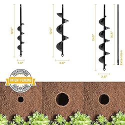 Patent Pending - Auger Drill Set: All Purpose Auger Drill Bit Set includes 1.6 x 12", 3 x 12", and 2.6 x 15" Drill Bits, plus a 16.5" extension. Ideal for fast and effortless digging in various soil types. (Drill not included) Easy To Use: Designed for easy use, it fits securely with any 3/8" drill - Keep the auger free from soil and debris when not being used Extend Your Reach: Our 16.5-inch Auger Drill Bit extension enables deeper drilling without strain. Experience back-friendly comfort and superior efficiency Enhanced Strength & Longevity: Our Auger Drill Bit Set features 360° Spiral welding for increased strength and a seamless, robust drive shaft. Made of upgraded heavy-duty alloy steel with a glossy black finish, it's built to last. Multi-Purpose: Our four-piece Auger Drill Bit Set is a versatile must-have for efficient gardening. Perfect for planting bulbs, vegetables, flowers, and trees, or for tilling soil in planter boxes. Beyond gardening, it's great for mixing seed, soil, fertilizer, or even paint. Effortlessly dig holes for fenceposts, outdoor lighting, or beach umbrellas