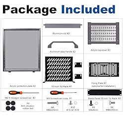 【DeskPi RackMate T0】It's made of aluminum alloy and acrylic frame mini chassis which you can setup your own cluster or home assistant server. 【10-inch width】The cabinet has a width of 10 inches, which is a relatively small size that saves space while accommodating sufficient equipment. It is suitable for small offices, home environments, and large enterprises looking to save space. 【Open Design】The cabinet adopts an open design, allowing easy access to all devices inside. This design facilitates equipment installation and maintenance, aids in device cooling, and maintains optimal working conditions. 【4U Standard】The cabinet has a height of 4U, which is a standard unit size. With 1U equaling 1.75 inches, 4U implies a height of 7 inches. 【Enhanced Cooling】Equipped with perforated side panels, the RackMate T0 promotes superior airflow, helping to keep your servers cool and operating at peak performance.