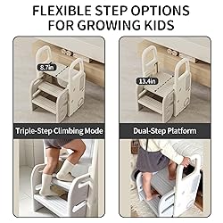 - The UNICOO 2-in-1 Toddler Step Stool is the perfect companion for growing kids, offering versatility and convenience. This toddler step stool foldable feature allow it to transform effortlessly from a dual-step platform to a triple-step climbing mode, adapting to your child’s needs as they grow. Ideal as a potty training stool, it helps toddlers gain confidence while learning independence in daily tasks like handwashing, reaching sinks, or assisting in the kitchen. With the unique push-and-store design, it can be compactly stored at just 10.9 inches, making it a space-saving solution for any home. Safety is a priority with its anti-slip steps and sturdy construction, ensuring secure footing for every use. This step stool for toddlers is lightweight, portable, and crafted with durable materials for long-lasting use. Whether used as a step stool foldable toddler for potty training, or a collapsible toddler step stool for reaching high places, this versatile toddler folding step stool combines functionality and practicality in a sleek, compact design.