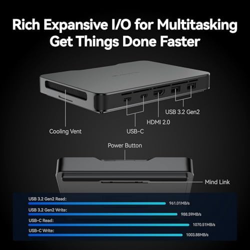 - Versatile and fast transfer interface: USB-C × 2, HDMI 2.0 (18Gpbs) × 1, USB-A 3.2 Gen2 (10Gpbs) × 2 . The HDMI interface supports 4K/60Hz display, the full-featured USB-C interfaces support both 8K/60Hz and 4K/240Hz display, and additional interfaces can be added via Mind Link. Besides, it also supports up to four 4K 60Hz displays on different monitors.