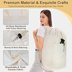 Heavy Duty Laundry Bag- Made of heavy-duty canvas fabric, this premium canvas laundry bag is soft, breathable, strong and sturdy. Reinforced stitching on each joint ensures longer lifespan and sturdy use. An essential laundry backpack for college X-Large Size & Front Pocket- Our Extra Large Laundry Bag is 29.5"H x 14"L x 9.5"W, large enough to hold 2-3 loads of laundry. A large front pocket 11.8"x11.8" with drawstring closure provides secure storage for laundry detergent or fabric softener Backpack Laundry Bag or Hanging Hamper- The adjustment straps can up to 33.5in, fit a wide variety of people, this laundry bag with straps is more comfortable for carry. With an Extra Hanging Handle you can hang this hamper bag on the wall or door Multi-Use Canvas Storage Bag- This sturdy canvas bag can be use as a nice travel laundry bag, camping laundry bag, college laundry bag, dirty clothes bag, hamper bag, travel hamper, grocery backpack, cargo bag, or a storage bag Washable Laundry Bag- Machine Washable, Wash with Cold Water in Gentle Cycle & low temperature Tumble Dry; Great gift for colleges, traveler or camper