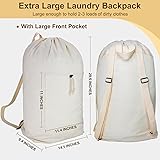 Laundry Bag Backpack, Canvas Laundry Bag with Straps & Drawstring Closure Washable Dirty Cloth Hamper Bag with Large Front Pocket for College, Travel, Laundromat, Camping (Beige)