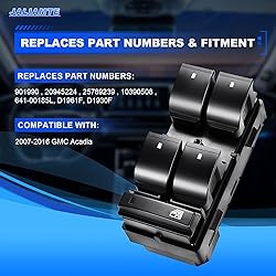 【COMPATIBLE MODELS】Fits for 2007 2008 2009 2010 2011 2012 2013 2014 2015 2016 GMC Acadia. The Power Window Switch is Used to Replace the Switch on the Left Side of the Main Driver's Side, Please Check the Suitable Model and OE Number Before Purchase. 【OEM NUMBER】Replace OE : 901990 , 20945224 , 25789239 , 10390508 , 641-00185L, D1961F, D1930F. Window Switches are More Durable than the Factory Power Window Switches and are a Perfect Match for Your Vehicle. 【HIGHER QUALITY】Window Switch are Made of ABS Plastic and PP Plastic Housings and Buttons for Better Durability Under Frequent Use and Excellent Texture. The Internal Interface Maintains a Stable Current Connection to Ensure Responsive Window Control Performance. 【EASY INSTALLATION】Direct Replacement for Factory Window Switches, Plug and Play. Please Make Sure the Vehicle is Turned off Before Installation, Remove the Original Window Master Switch Control and Install the New One. Stable Connection Ensures Sensitive Window Control Performance. 【EFFICIENT AFTER SALES SERVICE】If the Power Window Switch Has any Problems, Simply Contact Us for Giving You a Satisfactory Solution.We offer a Wide Variety of Automotive Accessory Categories, Ensuring That You Can Hit the Road With Peace of Mind.