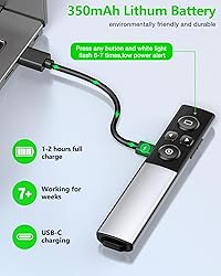 【Functions & Supports】Presenter remote support function: Black/Full screen, Page forward/ backward, Volume control,Open hyperlink, Switch windows and etc. Presentation pointer support systems:Windows 7/8 or above,Mac OS / Linux / Android. Powerpoint clicker support software: PowerPoint, Keynote, PDF, Word, Excel, Google Slides, Prezi and etc 【2-IN-1 USB Type C Receiver 】The presenter clicker comes with a unique dual-head design, USB & TYPE-C can meet all your need. You can smoothly switch between different port devices such as Mac, laoptop and pc, one for multiple computers. At the bottom of the slide clicker there is a magnet which can hold your USB dongle securely 【Bright Green Light & Wide Control Range】The green light presentation remote is about 8x brighter than the red one and is more visible against most backgrounds. The operating range of this wireless presenter is up to 164 feet and the light range up to 656 feet 【High Capacity Rechargeable Battery】 The presentation clicker is equipped with a 350mAh lithum polymer battery. It can be charged via the USB-C port, and will last for weeks on a 2 hour charge. When the white indicator light blinks slowly, it means the product needs to be charged 【Plug & Play and Portable Design】Plug the 2.4 GHz receiver into your computer's USB port and you're ready to start the show. You needn't have to set up anything and no software to install. The clicker for powerpoint presentation is suitable for all ages, when your presentation is over, simply store the receiver inside the presenter