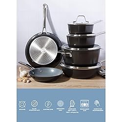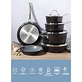 Sur La Table Kitchen Essentials Cool Commune Hard Anodized 10 Piece PFA Free Ceramic Non stick Interior Forged Durable Aluminum Pots and Pans Cookware Set - Black - Induction Compatible