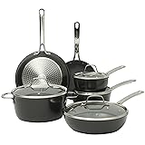 WHAT'S IN THE BOX: two frying pans (8 inches and 10 inches), two saucepans with lids (1.4 quarts and 2 quarts), one 3.3-quart sauté pan with lid and one 4.85-quart dutch oven with lid HAPPINESS IS HOMEMADE: Sur La Table Kitchen Essentials is all about making and sharing good food at home together. from preparing the freshest ingredients to the beautiful mess of cooking a family recipe, we encourage you to roll up your sleeves, mix up a happy kitchen, and set the table for free-flowing conversations over an easy, generous, and crowd-pleasing meal. CERAMIC NONSTICK COOKWARE: easy-release interior makes more room for healthier cooking options and less time for cleanup. HARD-ANODIZED ALUMINUM COOKWARE: tougher than traditional aluminum cookware, these pots and pans provide top-notch durability to get through the busiest times in the kitchen. whether you are cooking up a storm or casually making a one-pot dish, this cookware set delivers next-level heat distribution to ensure that any meal comes out evenly cooked and worthy to eat seconds on. INDUCTION-FRIENDLY: works on induction, gas, electric, halogen, ceramic, and glass stoves