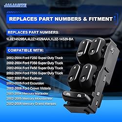 - This power window lock switch is Compatible with: 2002-2004 Ford F250 Super Duty Truck 2002-2004 Ford F350 Super Duty Truck 2002-2004 Ford F450 Super Duty Truck 2002-2004 Ford F550 Super Duty Truck 2002 2003 Ford Explorer 2002-2005 Ford Excursion 2002-2006 Ford Crown Victoria 2003 2004 Mercury Marauder 2002-2005 Mercury Mountaineer 2002-2006 Mercury Grand Marquis Replacement part numbers: 1L2Z14529BA, 4L2Z14529AAA, 1L2Z-14529-BA The window switch fits like the factory power window switch and matches your Ford F-Series, Ford Explorer, or Ford Excursion & Mercury Mountaineer interior perfectly. This power window control switch is manufactured to the highest production standards which is made of ABS plastic & PP plastic, features high impact resistance and better durability. JALIAMTE Electric Power Window Switch is durable replacement for your defective Window Switch. All Replacement Window Switch for the models listed in the compatability is 100 percent factory-tested. Simply remove the original main window control switch and install it. Driver side master window switch is plug and play.