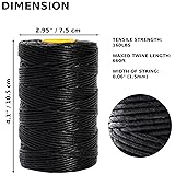 Premium Material: The waxed twine is made from 100 percent polyester. The width of black twine string is 0.06" (1.5mm). Machine twists waxed thread into a robust lacing cord with high tensile strength and excellent no-slip knot retention. In one heavy duty twine spool you will get 220 yards (200 meters) of strong waxed string Easy to Store:The box included with every 1PK of whipping twine. Keeps waxed cord clean from the elements and simple to dispense Anti-Slip Knots/Fray Ends: This heavy duty string has a strong friction resistance. The wax prevents waxed lacing cord from slipping and sliding or degrading quickly like zip ties will. With a proper cinch knot, this thick string will secure just about anything more tightly than a zip tie will Durable & Abrasion Resistant: Polyester is one of the strongest and most popular materials on the market for ropes, cords, and twines. These smooth synthetic fibers are highly resistant to moisture, temperature, salts, oils, solvents, UV rays, abrasions and most weather. Polyester twine performs better than cotton and nylon string Multi-Purpose: Using the great quality polyester and wax coating, giving twine string heavy duty a gentle “tacky” feel, UV durability, weather resistance, versatility and abrasion resistance. Wax thread is great for having on the job, camping, RVing, gardening, backpacking, woods shop, marine applications and much more. Waxed polyester cord is perfect for indoor or outdoor uses in landscaping, yard work and camping, crafts such as leatherwork, rope finishing, hanging deorations, and telecommunication cable bundling