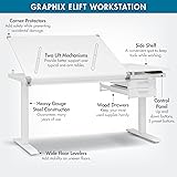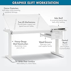 - Transform your workspace with the Graphix eLift Workstation, designed for ultimate comfort, functionality, and durability. This ergonomic drafting table offers customizable height adjustments from 29.25" to 46.5", allowing you to find the perfect position for drafting, drawing, or crafting. The included Control Pad features smooth electronic up, down, and preset buttons for easy adjustments, while the dual lift mechanisms ensure reliable support. For added flexibility, the top surface tilts from 0° to 30°, providing optimal comfort for any project. With a spacious 40" W x 30" D main work surface and a versatile dual-top design, this workstation adapts to your needs, whether you require a flat or angled workspace. Stay organized and efficient with ample storage options, including a fixed side shelf, two drawers, and a 40" pencil ledge. Built with heavy-gauge steel for maximum durability, the Graphix eLift is stable and safe, featuring wide floor levelers and corner protectors for added security. Ideal for artists, engineers, and crafters, this drafting table offers the perfect blend of form and function.