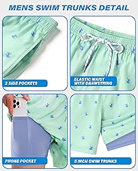 - FLAXIABLE FABRIC: Mens swim trunks are made of 90% Polyester, 10% Spandex, breathable, soft and high elasticity, printed color short funny swim trunks, comfortable, UPF 50+ and vibrant, make men's board shorts easy to full on and very comfortable to wear. SWIMMING TRUNKS DESCRIPTION: The mens stretch bathing suit design is fashionable color, elastic waist & hidden pockets. Swim trunk with lined is perfect for teens, mens, guys, father, boyfriend and big men. 2 in 1 swim trunks men, Featuring a compression liner, functional phone pocket, 5 inch inseam swim suit for men, elastic waist band with drawstring. Expertly strerchy swim trunks giving you a holiday Hawaii look. It works well for almost anything you’ve got on. Mens swimming shorts designed with bike shorts, printed funny color, the elastic shorts with big and tall king size can be opened for a relaxed fit, beach wear holiday vibe, or it can be weared it for a summer beach look. 5 Inch inseam men board shorts is suitable for both indoor and outdoor activities. Such as swimming, surf, fishing, running, gym, casual wear or relax in the beach or just at home. WASHING SUGGESTION: Hand wash recommended. Hand washing your swim shorts extends the life, durability and discreet black color and bright white. NOTICE: 1. Please do understand due to manual measurement may have inevitable deviations. 2. As different computers display colors differently, the color of the actual item may vary slightly from the above images, thanks for your understanding.