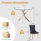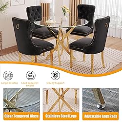 • 【Modern Glass Dining Table Set for 4】5 piece dining table set includes 36“ Round glass table and 4 Tufted Wing Back Upholstered Dining Chair. The sleek design seamlessly blends into your dining room and kitchen decor. This kitchen table and chairs set accommodates four people comfortably.【Premium Tempered Glass】This 36inch round dining table made of 0.39 inch thickened tempered glass top that offers an elegant look. This tempered glass is made to be stronger and safer than regular glass, making this more resistant to breakage and shattering. Easy wipe clean, hard wearing surfaces keeps the dining set looking as good as new for years to come.【High-Quality Velvet Fabric】Our tufted dining chair is covered with high-quality velvet fabric, which is skin-friendly and breathable, and the thick fabric feels very delicate. Sitting on the high-density sponge-upholstered dining chair, you will have a supportive sitting posture and feel great comfort.【Space Saving Design】Table Dimension: 36” x 36” x 30” (L x W x H), Weight Capacity: 200 lbs; Chair Dimension: 19.69" x 24.02" x 36.22" (L x W x H); Chair Capacity: 200 lbs. (each), 36inch Square table top is spacious enough to easily seat 4 people for a meal, making it suitable for living room, apartments.【Easy Assembly and Service】Come with easy-to-understand instructions to help you put it together easily.You only need to take about 30 minutes to assemble dining table set. Any problems about upholstered dining chairs ,please feel free to contact us,we will try our best to deal with it within 24 hours.