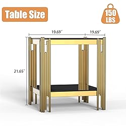 【Luxury Metal End Table】Our end table adopts a modern minimalist design style, with a golden stainless metal frame and tempered glass counter top complementing each other, adding a fashionable touch to your living room. Clean lines and minimalist design add style to your living room. 【High Quality Material】This Living room side table is made from high-quality materials that are built to last. The golden stainless steel frame is rust-resistant, ensuring that your coffee table will look as good as new for years to come. The tempered glass top is durable and shatterproof, providing a safe and reliable surface for your living room needs. 【2-Tier Storage Space】The glass sofa table top provides spacious space for living room supplies and keep your daily essentials nearby, you can place fruits, coffee, green plants, decorations, etc. on this spacious glass tabletop. The bottom glass shelf, gives you extra space to store magazines and toys, and make your room tidy and neat. 【Perfect Living Room End Table】Overall dimensions: 19.69" (L) x 19.69"(W) x 21.65"(H), appropriate size meet your daily use needs. The height of the end table is moderate, suitable for use with various sofas, allowing you to easily access items while enjoying comfort. Excellent design fits well with your other furniture. 【Easy Assemble and Good Service】The glass side table can be easily assembled with necessary hardware and tools included within 10 minutes. The glass countertop is easy to clean, with only a gentle wipe to remove stains and dust, making it convenient for daily maintenance. If for any reason you are not completely satisfied, our customer service team is always here to help.