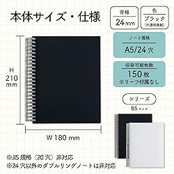 [Features] Compatible with open ring notes, twist notes, compatible leafs. Commercially available A5/24 hole, semi-B5/29 hole wire ring notebook can be disassembled and stored Product Dimensions (W x D x H): 7.1 x 0.9 x 8.3 inches (180 x 24 x 210 mm) Weight: 2.8 oz (79 g) [Materials] Cover: Polypropylene (Body Fabric Thickness: 0.04 inch (1.0 mm)), Binder: Polycarbonate Standard: A5