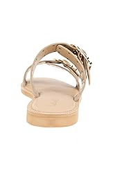 - Golden buckles detail this sandal topped with a duo of buckled straps that offer a comfortable fit.