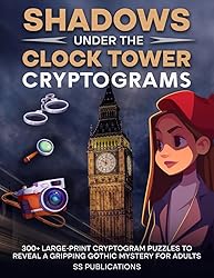 - 🔍 300+ Cryptograms. One Gothic Mystery.Step into the fog-drenched streets of Ravenshore and crack the codes that reveal a thrilling detective story. Unlike generic cryptogram books filled with random quotes, this immersive puzzle adventure challenges you to solve 334 large-print cryptograms — each one unlocking a new piece of a dark and twisting mystery. 🧩 Why Puzzle Lovers Choose This BookSolve 300+ Cryptograms – Hours of brain-teasing entertainment.Uncover a Full Mystery Story – Follow Detective Ellie Crane as she unravels secrets hidden beneath the clock tower.Large-Print, Easy-to-Read Format – Comfortable solving for all ages.Hints + Complete Solutions Included – Perfect for beginners and pros alike.Relaxing Yet Challenging – Strike the perfect balance between stress relief and mental stimulation. ✨ What Makes It Different Most cryptogram puzzle books recycle random quotes. Shadows Under the Clock Tower delivers something unique:A continuous gothic detective tale revealed one puzzle at a time.A mix of suspense, betrayal, and intrigue woven into every solution.A bonus downloadable mystery story (QR code inside).🎯 Perfect ForFans of murder mystery puzzle books for adultsLovers of logic puzzles, brain games, and cryptogramsMystery and gothic fiction readers who crave something interactiveAnyone seeking hours of relaxing, story-driven fun 📖 Your Mission: Crack the cryptograms. Reveal the mystery. Expose the truth hidden in Ravenshore. The clock is ticking —grab your copy now and begin decoding tonight.