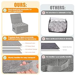[Durable & Reliable Protection]: Constructed with a hard-shell bottom, sides, lid and sturdy thick plastic board for robust protection. The soft, non-woven interior gently cradles your drinkware. Perfect for storage and moving – say goodbye to broken glassware! [Move & Transport with Confidence]: These sturdy stemware storage cases are crafted from premium linen fabric, durable PP plastic board, and a soft, anti-collision sponge & non-woven fabric lining for superior protection. The rigid exterior safeguards against bumps and impacts, even during shipping. Move or transport your glassware worry-free! [Reinforced Handles & Stackable Design]: Featuring two strong, reinforced handles for easy carrying. The hard top lid allows for secure stacking and keeps your glasses dust-free. Includes a label holder for quick and easy content identification. Premium, heavy-duty two-way zippers glide smoothly for easy access and ensure long-lasting durability. [Generous Wine Glass Storage]: Include 2 pack wine glass holders, and accommodates up to 24 glasses with insert dividers. Dimensions of each are 16"L x 13"W x 9.6"H, with 12 individual compartments measuring 4" x 4" x 9.2" each. [Versatile Storage for Every Occasion]: Use these moving boxes to safely store your seasonal and special occasion glassware, including wine glasses, champagne flutes, china, stemless glasses, mason jars, vases, candles, drinking glasses, goblets, martini glasses, mugs, tea cups, Christmas ornaments, and more!