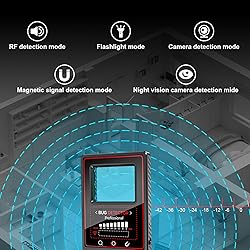 Unique Infrared Night Viersion Camera Detection: Simply move the detector near any infrared night vision camera, and it triggers immediate alerts—no tedious manual scanning required. Advanced 6-in-1 Multi-Function Detection: this multi-functional camera detector includes six features, which are Night vision detection (NEW), Infrared hidden camera detection, Wireless signal detection, RF signal detection, Magnetic field detection and flashlight. Superior Signal Detection with 8-Level AI Precision: Detects radio waves, 2G/3G/4G signals, SIM card bugs, and magnetic field fluctuations. Covers a frequency range of 1 MHz - 6.5 GHz. Features an upgraded AI chip with 8 sensitivity levels for precise signal tracking, detecting sources from 2 inches to 50 feet. Includes vibration, sound, and silent alarm modes. Privacy Protection: this GPS detector uses passive, wireless, and infrared scanning to detect eavesdropping devices, GPS trackers, audio bugs, and both wired and wireless cameras. Ensures privacy in hotels, offices, or any untrusted environment. Easy to Use & Portable: Rechargeable lithium-ion battery with 1-hour fast charging provides up to 30 hours of use and 30-day standby. Made from premium PC material, lightweight (only 30g), and compact—ideal for travel, home, or office security.