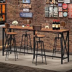 Flexible Charging Station: Our bar table features a built-in power strip with 2 outlets and 2 USB ports, allowing for effortless device charging. The adjustable mounting position of the power strip adapts to various space layouts, ensuring flexibility in the power supply Practical Size Layout: Sized at 70.9"L x 15.7"W x 35.4"H, the entryway table offers ample space and a reasonable height. This versatile piece serves as a stylish entryway table, a lively bar counter, or a modern dining table, making it ideal for any setting Sturdy Structure: Crafted from premium particleboard and a robust metal frame, this dining table boasts reinforced stability with X-shaped pipes, triangular supports, and sturdy legs with footrests. It supports up to 220 lb for long-lasting use Retro Industrial Style: The bar table combines retro brown panels with a black metal frame, embodying a minimalist industrial aesthetic. Its unique design is not only aesthetically pleasing but also adds a touch of fashion and personality to your home Clear Assembly Instructions: Designed for user-friendliness, the entryway table comes with numbered parts and a clearly illustrated manual to guide you through assembly. Even a first-time assembler will be able to set up the table in no time