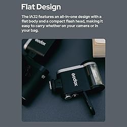 - The Godox iA32 is a compact and lightweight universal on camera flash, ideal for photographer who prioritize portability. It always ready to go anywhere, making it perfect for travel photography and everyday street shooting. Its adjustable flash tube offers a -7° to 90° range rotation, easily controlled by the side dial. This design also enables bounce flash effects for more varied lighting options. It offers 8 levels power flash(128/1-1/1) in 1/3 step increments with both auto and manual modes to suit any scene or lighting condition. Powered by 2 AA batteries, the iA32 provides a recycling time of 2.5 seconds and up to 490 flashes at full power. It compatible with multi brands cameras appliable a universal touch point shoe mount. The compact and lightweight iA32 mini flash delivers a 5600K color temperature and a guide number of GN 15, ensuring vibrant and well-lit shots every time. Its portable design makes it the perfect everyday shooting companion, empowering you to elevate your photography skills effortlessly. Not compatible with Sony zv-1f, A9III, A99, A77, A350 cameras; Not compatible with Fuji x-a3, x100f, x100t cameras; Not compatible with Canon EOS 1500D 2000D 3000D 4000D 200IID R6II R7 R8 R10 R50 cameras