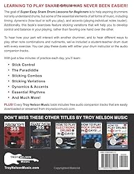 - Learning snare drum has never been easier! Super Easy Snare Drum Lessons for Beginners takes a progressive approach to snare drum education. Each of the book's lessons builds on the previous lesson, using drum rudiments and simple note combinations to reinforce the material.This book's easy-to-accomplish lessons feature simple snare drum exercises, extra-large music staffs and notes, sticking notated inside the noteheads for ease of reading, secondary parts for duets with a drum teacher or another drummer, and audio tracks so anyone—regardless of skill level or age—can quickly jump into the world of snare drum playing!With just a few minutes of practice each day, you'll learn:Stick ControlThe ParadiddleSticking CombosSticking VariationsDynamics & AccentsEssential RhythmsAnd Much More!Veteran drum instructor and author Dave Schoepke presents the easiest way to learn snare drum! This is the ultimate snare drum book for adult beginners and kids!With each lesson, you'll get:Extra-Large Notes & StaffsSticking Notated Inside the Noteheads for Ease of ReadingSecondary Parts for Duets with Drum Teacher or Another DrummerSimple Tips & InstructionDownloadable and streamable audio tracksFREE: Easy access to instant audio downloads from Troy Nelson Music’s website is included.BONUS: Includes customer support! Questions during practice? Just email us, and we'll happily help you.About Dave Schoepke: Dave Schoepke hails from the Greater Milwaukee area. He has been a professional recording and touring musician for three decades, including treks across North America and Europe. His credits include Jethro Tull guitarist Martin Barre and songsmith Willy Porter. He has been a creative force in Willy’s band since 2002.An active session musician with appearances on over 50 albums, Dave does remote recording from his home studio for artists worldwide. He appears on recordings with such diverse artists as Bryan Lee, Darrell Scott, Natalia Zukerman, Raining Jane, Billy Flynn, Doug Woolverton, Victor DeLorenzo, Michael Bettine, Russ Johnson, Todd Sickafoose, Brian Ritchie, Chuck Garrick, Allison Miller, Ray Bonneville, Paul Cebar, and Alan Thomson. Dave has also recorded over a dozen instructional CDs for print music publisher Hal Leonard, covering many genres.His solo drums project has produced three all-drums albums and garnered acclaimed reviews from Modern Drummer, Recording Magazine, and numerous online music critics around the world. The 400th issue of Recording Magazine includes a multi-page feature on Dave’s process of writing and recording his album Drums on Low.Dave has been teaching drums for over 30 years and has done numerous clinics and educational-based symposiums with legendary artists Jeff Coffin, Ed Thigpen, Paul Wertico, Dom Famularo, Gregg Bissonette, and Carmine Appice. He maintains a busy schedule of teaching, touring, clinics, and sessions and is always striving to evolve in every facet of his music-making. For lesson inquiries or questions, Dave can be reached via his website, daveschoepke.com.ABOUT TROY NELSON MUSIC: Since 2016, Troy Nelson Music has offered customers the most comprehensive and easy-to-follow lesson books and songbooks for a variety of instruments—everything from guitar and mandolin to piano, saxophone, and clarinet. With 30+ years in the music publishing industry, veteran guitarist Troy Nelson has sold hundreds of thousands of books as both an author and publisher due to the quality and effectiveness of his books and the service his company provides.
