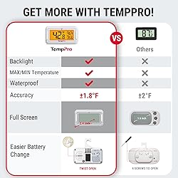 【Backlit Display for Clear Visibility】The oversized LCD screen with bright backlight ensures easy readability, even in dark freezers or low-light conditions. Say goodbye to squinting while checking your fridge temperature with our freezer Thermometer 【Hassle-Free Battery Replacement】Unlike other fridge thermometers that require a screwdriver to open, our battery cover can be easily twisted open with a coin. No hassle, no tools—just swap batteries in seconds! 【Upgraded Accuracy, Wide Measurement】This digital thermometer measures temp between -4℉-122℉ with ±1.8℉ high precision, perfect for home refrigerators, freezers, car fridges, coolers and etc. It can also double as an thermometer for house, tracking indoor outdoor temp 【Superior Waterproof Rating for Enhanced Durability】With an IPX6 waterproof rating, this thermometer for fridge runs safely and reliably over time, making it ideal for refrigerators, freezers, and even damp environments like basements or wine cellars 【Max/Min Temp Recording】Keep track of temperature fluctuations with the built-in max/min record function, allowing you to easily view the max/min temp in the past 24 hours from the cooler thermometer. This feature helps you monitor sudden changes in your fridge, ensuring food safety 【Flexible Placement Options & Compact Design】This fridge temperature monitor can be placed in multiple ways: stand it on a shelf, attach it magnetically, or hang it with the hook; Its small size makes it perfect for mini fridges, so you can easily take it with you and use it anywhere without it taking up too much space ThermoPro is now TempPro! TempPro will maintain same mission, same operation backbone and same products as ThermoPro; Random delivery, you may receive either a ThermoPro or TempPro branded product