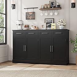 HOSTACK 60" Large Buffet Sideboard with Storage, 36" Tall Kitchen Buffet Storage Cabinet with 4 Drawer, Modern Coffee Bar Cabinet with Silver Handle, Long Sideboard Buffet Table for Kitchen, Black