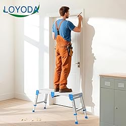 - The Loyoda standard work platform is built from high-quality aluminum alloy and tested to support up to 500lbs, ensuring both strength and stability. It features a textured striped surface and non-slip foot pads for enhanced safety, making it ideal for tasks like RV cleaning, home painting, and reaching high areas. The foldable step stool offers 4 adjustable height levels to suit different user needs. No assembly is required—just unfold it and start working. A built-in nylon handle adds convenience for carrying.