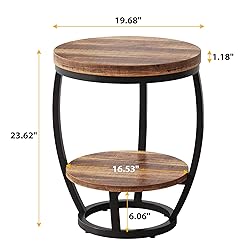 • Product name: Round End Table Product size: 20 x 24 inches Product material: MDF & Metal Product Description: Bring style and function to your home with this rustic round end table. Designed with a wood grain finish and sturdy metal frame, it blends farmhouse, industrial, and modern décor while providing reliable daily use. The 2-tier design offers convenient storage for books, lamps, drinks, or décor, keeping essentials close at hand. Compact and versatile, it works perfectly as a living room side table, a bedroom nightstand, a bedside table for small spaces, or even a small coffee table in a cozy corner. Made from premium MDF with a reinforced frame, this end table is built for durability and stability. The smooth surface is easy to clean, while the open shelves create a tidy and organized look. Ideal for apartments, dorms, and homes where space is limited, it adapts to any setting and enhances both living room furniture and bedroom furniture. Assembly is quick and simple with clear instructions and tools included, letting you enjoy your new accent table in minutes. Durable, stylish, and multi-functional, this small round table is the perfect addition to any home décor.