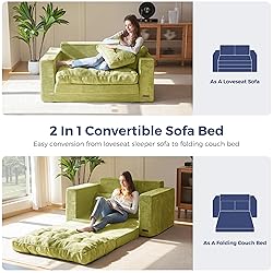 MAXYOYO Convertible Sofa Bed, Pull Out Loveseat Sleeper Sofa, 2 in 1 Folding Couch Bed, Fold Out Floor Couch with Pillows for Living Room Bedroom Lounge, Green
