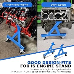 Good Designed for Compatibility: Ensuring a precise fit for V8 LS engines, Perfectly balanced with engine and transmission assembled together Heavy-Duty Construction: Made from premium carbon steel with a black powder-coated finish,this LS engines mount bracket offers outstanding strength, corrosion resistance,ensuring long-lasting rugged performance,it supports up to 300 lbs Simple Install:The package include all necessary hardware and instruction.There have 2 double headed open end wrenches,One is 12mm and another is 14mm. provides secure mounting of your LS engine to your engine stand. Enough Clearance: Also the IS engine stand built very sturdy, fits perfect and has enough clearance even with the oil pan installed.plenty strong enough to handle engine Versatile availability: 360° rolling caster , easy to move and store, will not tip over or feel unstable.It can well loaded 8.1L big and heavy engine,providing comprehensive support for replace the engine, race modifications, custom installations.