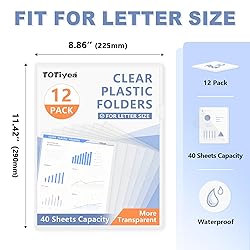 【Perfect Fit for Letter Size Paper】12 pack clear folders measuring 8.6" x 12.2", which fits standard 8.5 x 11" paper, these plastic pocket folders are designed to fit standard 40 sheets letter size papers 【Durable Material】 These project folders are made of high-quality PP plastic, ensuring durability, tear resistance resisting tears and damage to meet your document storage and organization needs 【Clear View, More Transparent】With high transparency, these plastic paper sleeves offer a clear view of your documents. The smooth surface is easy to clean and resists dirt buildup. More transparent design allows for easy identification and quick access to your documents without the need to open the folder 【L-Type Sheet Protectors】Our clear plastic folders feature a two-sided seal with top and right-side openings, allowing for easy loading from the top or side. The thumb notch design provides convenient access 【Versatile and Portable】Ideal for work reports, presentations, loose pages, teaching materials, homework assignments, and protecting/storing artwork, our clear folder sleeves are versatile for any setting, be it school, office, or home