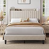 Yaheetech Full Size Bed Frame with USB Charging Station and Storage Shelf/Upholstered Headboard Platform Bed with Wing Side/Wooden Slats Support/Noise Free/No Box Spring Needed/Easy Assembly, Beige