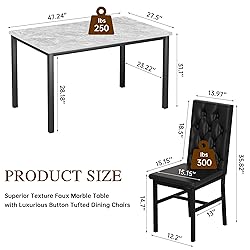 Exquisite Small Dining Table Top: Trendy texture faux marble countertop have new color: White, Beige, Gray. This dining table for 4 suitable for small spaces Button Tufted Dining Table Chairs: Luxury button-tufted dining chairs with foam-padded back and seat cushions and 100° tilt angle for ergonomics. Stability and comfort are the goals of our manufacturing Sturdy & Durable Kitchen Dining Table Set: 5-piece dining set with MDF and faux marble texture. H-shaped chair construction for sturdiness, foot protectors prevent floor scratches and shaking Table and Chair Set 4: Easy to clean's kitchen dining set with 4 upholstered dining chairs. Modern simple color scheme with compact and delicate design Easy To Assmeble Table Set: The 4-person dining table set includes all the parts and tools you need to assemble, simply follow the step-by-step instructions to set up your dining area.Table load capacity 250LBS, chair load capacity 300LBS