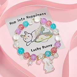 ‌Colorful Design‌: This bracelet features a variety of bright beads, including pink, blue, purple and transparent beads. The bracelet is equipped with a cute lucky rabbit pendant, as well as small pendants such as stars, hearts and bows, which symbolize cuteness and luck. It is very suitable for the joyful atmosphere of Easter. High-quality materials‌: The beads of the bracelet are made of high-quality materials, which are not easy to fade or damage, ensuring that they will remain as new after long-term wear. The metal pendant is also made of environmentally friendly and non-allergenic materials, suitable for all skin types. Applicable size: This bracelet comes with a soft elastic rope. Just pull the rope to loosen the bracelet and it can be worn. It is suitable for women of any other age. ‌Perfect gift: The words "Hop into Happiness" and "Lucky Bunny" on the card convey a positive message, hoping that the wearer can find happiness and luck in daily life. It is a perfect holiday gift for family and friends. Versatile matching‌: This bracelet is not only suitable for wearing on Easter, but also can be used as an everyday decoration and matched with various styles of clothing. Whether you're wearing it casually or everyday, this bracelet will add a pop of colour to any look.