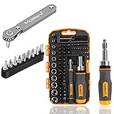 Compact Right Angle Design for Tight Spaces: Featuring the 11pc right angle screwdriver set with a 4" long, 3/8" thick driver handle, ideal for confined areas where traditional tools can't fit. Perfect for tackling tough angles in machines, cars, boats, and tight spots Versatile 77-Piece Tool Set: The bundle includes a complete 77-piece screwdriver bits and socket set with 37 bits, 25 precision bits, and 10 sockets, offering a wide range of options for DIY projects, household repairs, or professional work. Smooth Ratcheting System for Precision Work: Both sets feature ratcheting screwdrivers with reversible systems, ensuring smooth operation in both directions and effortless adjustments, making tasks faster and more efficient. Portable & Organized Storage Cases: Both sets come in durable, portable cases to keep all tools organized and secure. Ideal for on-the-go repairs, workshops, or storing in compact spaces. Durable Materials Built to Last: Crafted with high-quality CRV6150 steel, these tools are built for durability, precision, and reliable performance. A thoughtful gift for handymen, DIY enthusiasts, or professionals.