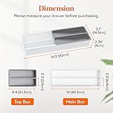 - This cutlery drawer organizer features a compact design with dimensions of 16.5" × 5.7" × 2.4" (42 × 14.5 × 6 cm), making it a perfect fit for most drawers that are at least 2.4" (6 cm) high. This kitchen drawer organizer features a unique double-layer design with four compartments that you can stack to maximize your drawer space, or you can take out the upper layer to store more cutlery.Each compartment features a deeper design that can perfectly accommodate your various cutlery, so you don't have to worry about the end of the cutlery extending beyond the storage box and causing the drawer to not close. The cutlery storage box is made of thick, sturdy, high-quality PP material that is BPA-free, so you can rest assured that it is safe to use for all forms of cutlery. This construction means it is sturdy.A quick wipe with a damp cloth will keep this cutlery organizer looking new for years. Note: Not dishwasher safe.