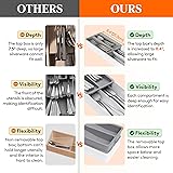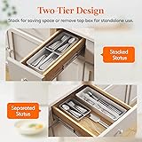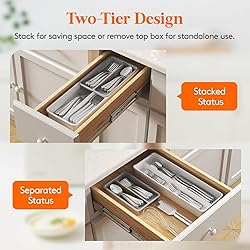 Perfect for Narrow Drawers: Measuring 16.5 × 5.7 × 2.4 inches (42 × 14.5 × 6 cm), this silverware drawer organizer ensures a perfect fit for most standard or slightly narrow drawers, keeping your knives, forks, and spoons neatly arranged. Please measure your drawer before purchasing Two-Tier Design: Featuring a unique two-tier design with four compartments, this cutlery drawer organizer allows you to stack them to maximize drawer space or remove the top box for standalone use Deepened Storage Space: Each compartment is deepened to securely hold more silverware, allowing you to stack your silverware without worrying about the ends sticking out and preventing the drawer from closing Easy Access: Deepened compartment design ensures the front ends of utensils remain visible, making it easy to identify and quickly locate the silverware you need Premium Material: Made from thick high-quality PP material, this flatware organizer for drawer is sturdy, BPA-free, and safe for all utensils. And it is easy to clean with water or a damp cloth. Please note: it is not suitable for the dishwasher