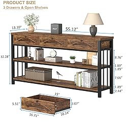 - 【Ample storage with Drawers & Shelves】 This 55-inch brown sofa table with storage offers 3 drawers and 2 open shelves, providing abundant storage to keep your space neat. Use the tabletop for lamps, vases, or decor while displaying books and photos on the open shelves. The hidden drawers ensure a clutter-free surface, making brown console table with drawers ideal for entryways, living rooms, or behind sofas, adding a rustic touch to your home 【Rustic & Industrial Versatility】 With a rustic wood grain and industrial metal frame, this brown entryway table with 3 drawers complements a variety of spaces and styles. It serves as a console table, TV stand, or home decor piece in the living room, bedroom, hallway, or office, delivering both function and modern aesthetics in one design 【Premium Quality & Ideal Dimensions】 Measuring 13.39”D x 55.12”W x 32.28”H, this brown sofa tables for living room is crafted with high-quality MDF and supported by sturdy metal legs for durability and long-lasting performance. The clean edges, sleek lines, and elegant textures make this brown sofa table with drawers a sophisticated addition to any space. Functional and attractive, brown console table with storage pairs functionality with elegance to elevate the appeal of your home 【Sturdy Structure with Excellent Weight Capacity】 Equipped with six reinforced metal support tubes, this brown sofa table with drawers offers outstanding stability and weight-bearing capability. The tabletop holds up to 150lbs, while each of the two lower shelves also supports up to 150lbs. Additionally, each drawer is designed to hold up to 50lbs, ensuring safe and secure storage for all your belongings without compromising the table’s stability 【Quick Assembly & Support】 For the assembly of this 55” brown entryway table with storage, we provide clear instructions and all necessary tools. If you have any questions, you can email us anytime, and we will respond within 24 hours