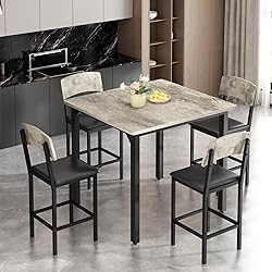 【 Comfortable Chair 】 : The padded seats are filled with high-density foam and paired with ergonomically designed curved backrests that perfectly conform to the body's natural contours, offering exceptional comfort. Whether working, dining, or relaxing for extended periods, they effectively reduce back pressure and fatigue, ensuring a more comfortable experience. 【 Space Saving 】 : The counter height table optimized for small spaces, the chairs can be fully tucked under the table, saving significant floor space and making them ideal for compact apartments, kitchens, or living rooms. The compact size and smart structural design maintain functionality while keeping the area tidy and visually appealing, making it a perfect choice for small-space homes. 【 Suitable for Various Scenarios 】 : This 5-piece dining table set is not only suitable for daily meals but also functions as a desk, computer table, workstation, or leisure area, meeting the needs of various living scenarios. Whether for family gatherings, afternoon tea, or work and study, it effortlessly adapts to different roles, offering a versatile and flexible experience. 【 Strong and Durable 】 : The table surface is made of FSC-certified wood. Constructed with high-quality MDF tabletops and thickened metal frames, the dining table set for 4 is sturdy and durable, capable of supporting a total weight of up to 250 lbs. The reinforced table and chair legs ensure stability without wobbling or tilting during use, providing a safe and reliable experience for long-term family use. 【 The Convenient Cleaning Maintenance 】 : The 5-piece dining table set are coated with waterproof, stain-resistant PVC, effectively repelling stains and grease. Daily cleaning is as simple as wiping with a damp cloth, saving time and effort. Additionally, the smooth rounded edges prevent accidental bumps, ensuring family safety and extending the furniture's lifespan.