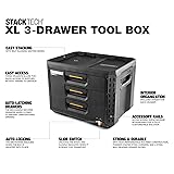 - Built for the demands of real jobsite work, the ToughBuilt StackTech XL 3-Drawer Tool Box is a professional-grade storage solution designed to keep tools, parts, and accessories secure, organized, and always within reach. Whether you’re a contractor, electrician, plumber, HVAC tech, or mechanic, this stackable toolbox delivers the strength, accessibility, and customization today’s tradespeople need. Its rugged high-impact polymer body, powder-coated steel corners, and steel ball-bearing drawer slides ensure lasting durability in harsh environments, from construction sites to auto garages. This heavy-duty toolbox features a patented self-aligning stacking interface that makes setup fast and effortless—StackTech boxes automatically nest together and lock into place for secure transport. The auto-locking mechanism engages instantly when stacked, while the prominent lock indicator gives you peace of mind knowing your system is safe to move. Need something quickly? The three full-extension drawers are self-latching and provide instant access to tools and hardware without needing to unstack. The drawers include a total of 22 removable dividers, giving you full control over internal organization for everything from hand tools and drill bits to screws and electrical fittings. Weighing just 14 kg and supporting up to 22.6 kg (50 lbs.) of evenly distributed weight, the StackTech XL 3-Drawer Tool Box is built for mobility and efficiency. Integrated accessory rails allow you to add quick-release components, helping you build a modular tool chest system tailored to your trade. Whether you're on the move or setting up shop onsite, this customizable toolbox offers stackable convenience, reliable strength, and organized storage in one jobsite-tough design.