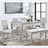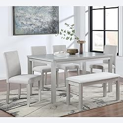 • Wooden Dining Rectangular Table with Bench, Kitchen Table with Bench for Small Space, 6 Person Dining Table - Silver GreyUpgrade your dining space with this Wooden Dining Rectangular Table with Bench in a sophisticated Silver Grey finish. This 6-piece set includes a spacious rectangular table, four dining chairs, and a comfortable upholstered bench. The acrylic crystal accents on the table add a touch of elegance, making it the perfect addition to your dining room, kitchen, or living area.Key Features:Elegant Dining Table: The rectangular tabletop is made of high-quality MDF with a faux natural wood grain design for added elegance and durability. The table is adorned with acrylic crystal crushed diamonds along its edges, giving it a beautiful and modern look.Spacious & Versatile: This set comfortably seats up to six people, making it ideal for family meals, gatherings, or entertaining guests. It fits perfectly in dining rooms, kitchens, or any space where you need a functional yet stylish table.Comfortable Upholstered Bench: The bench features high-quality fabric upholstery with foam padding for maximum comfort. It can be used not only as a dining room bench but also as a versatile piece in your entryway or bedroom.Upholstered Chairs: The four dining chairs are made of solid wood and feature upholstered seats and backrests with high-quality foam padding. The thick, soft backrest and cushioned seats provide excellent support and comfort for long, relaxing meals.Durable Construction: The solid wood frame ensures long-lasting stability and durability. The smooth, water-resistant tabletop is easy to maintain with a simple wipe, keeping your dining space looking great.Product Specifications:Color: Silver GreyMaterial: Table: Solid Wood + MDF, Chairs & Bench: Acacia Wood + Bent Wood + Rubber Wood + FabricDimensions: Table: 58.5"L x 34.5"W x 30"H, Bench: 37.5"L x 14.8"W x 19"H, Chair: 16.5"W x 21.5"D x 35"H, Seat Depth: 16", Seat Height: 19"Weight Capacity: Table: 330 lbs, Bench: 330 lbs, Chair: 330 lbs per piecePieces Included: 1 Dining Table + 1 Bench + 4 Dining ChairsPackage Count: 2 boxesAssembly & Care:Assembly: Some assembly is required. All tools and instructions are included for an easy setup process.Care: To clean, wipe the table with a damp cloth. The chairs and bench can be wiped down with a soft cloth to maintain their finish.This Wooden Dining Rectangular Table with Bench in Silver Grey offers a perfect balance of style, comfort, and functionality, transforming your dining experience and adding a modern touch to any room.