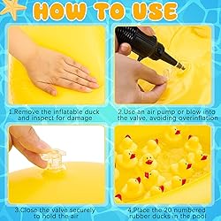 Complete Duck Pond Matching Game Set: jump into the fun with this duck pond game set, designed for instant entertainment; It includes a 35.5 x 27.6 x 8.2 inches inflatable duck pond and 20 floating yellow rubber ducks, each featuring a number on the bottom for a matching challenge Simple & Engaging Gameplay: float the ducks in water, flip to find matching pairs, and keep score as kids compete; A great way to build memory, concentration, and problem-solving skills Easy to Set up & Play : simply inflate the pond, fill it with water, and let the fun begin! The floating ducks move naturally, adding an element of excitement as players try to find matching numbers Bright Eye-catching Design: the floating rubber ducks feature a cheerful yellow color, while the duck-shaped inflatable pond adds an extra touch of charm; The playful design makes it easy to dive into the game and create lasting memories with family and friends Festive Party Addition: make your event stand out! The duck pond game's vibrant colors and adorable duck theme make it a great addition to pool parties, carnival games, and celebrations; It doubles as a fun game and a lively party decoration